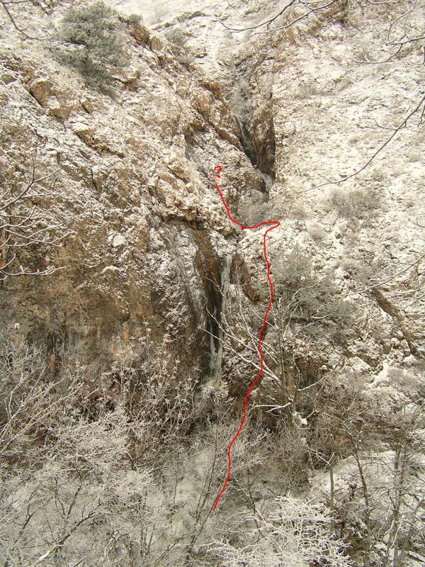 Вид со скалы правого берега. После выхода за водопад -- подъем по некрутому борту ущелья до перевала.