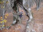 Выходим из леса на поляну к туру, далее тропа на гору. Видны близлежащие горы и все красоты. Останавливаемся сделать снимки. Теперь уже наша собака безумно счастлива от того, что пошла с нами. Выходим на гору и идём по краю обрыва, что бы найти спуск к пещерам. Вышли на небольшую седловину с тропой вниз. Спускаемся вниз вправо по звериным тропам. Здесь много косуль, собака их гоняет, а мы не находим пещеры и решаем возвратиться обратно на седловину и продолжить путь. Вышли на седловину, я заметил тропу влево и какое-то укрытие. Отсюда начинаются пещеры. Укрытие осталось от отшельника, который здесь когда-то жил. Далее идут гроты и пещеры, их здесь много и все не успеваем осмотреть, потому что все устали. Обращаем внимание на дерево, которое растёт у скалы и приросло к скале, ему несколько сотен лет.