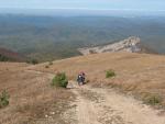 Утром выходим на Кемаль-Эгерек. Погода очень хорошая. В бинокль наблюдаем пешеходников гуляющих по высшим точкам Крымских гор. По яйле выезжаем к шлагбауму, здесь крутой спуск. Выезжаем к Беседке Ветров, предварительно разведываем наличие лесников на ней. Ещё вчера пешеходники с Кермена нас пугали жестокой охраной крымского заповедника. На Беседке Ветров смотрим виды на море и горы, и обедаем в овражке. Дальше идёт асфальт вниз, собаке уже труднее бежать за нами.