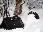 Вечером - недолгий просвет в погоде и снова снег, а утром - сумрачный свет в палатке, присыпанной мокрым снегом. В блокнот же, под попытки писать, падают снежинки. Три раза он открывался, и каждый раз ловил снежку.