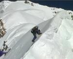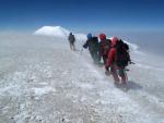 Высота 6670. Восточный гребень Революции. Погода звенит, ветра нет. Как случилось, что я иду первым, даже не знаю. Широкий и ровный, на первый взгляд, гребень вдруг начинает круто крениться влево, а справа обрываться карнизом. Чёрт! Фирн жёсткий, как лёд. Одной рукой держусь за ледоруб, второй - за край гребня. Дыхание учащается до предела - всё-таки к этой высоте ещё надо привыкать. Хочется отдохнуть, но как расслабить икры? Приходится стоять на передних зубьях, опёршись на клювик ледоруба - в такой фирн его древко не войдёт, а ледобур держать не будет. Вниз лучше не смотреть - до ледника как до Земли с орбиты. Хух, наконец-то выполаживается, можно расслабиться.