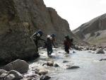 Ко всеобщей радости, прижим оказывается вполне проходимым, требующим нескольких несложных переправ и обхода по склону с набором 20 метров. Правда, то, что этот же вариант будет реализуем и через полтора месяца, после спуска с Коммунизма, станет ясно лишь потом, когда эти рукава потребуют холодной погоды (уровень воды был на 30 см ниже обычного!) и верёвочной страховки.