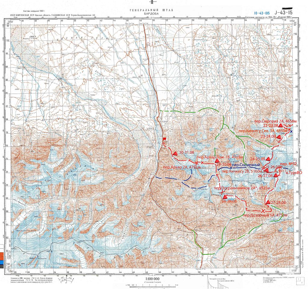 Карта центральной и восточной части Заалайского хребта (J-43-015, Бардоба)