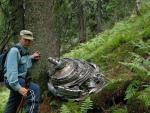 Лізу догори, поки що пралісом, раптом, на межі ліс-жереп побачив тьмяно виблискуючий, величенький металічний агрегат, що приперся до смереки. Дивина, це ж турбіна від літака! Хоча і понівечена, але без слідів корозії, вражаюча своєю технічною досконалістю. Повезло так повезло - двадцять метрів вліво чи вправо і не бачити мені турбіни. Раз є турбіна, вперта в стовбур, то вище повинно бути те місце, з якого вона скотилася, інакше звідки ж їй взятися серед лісу. Кілька метрів вище турбіни виколупав з ґрунту якісь дрібні металеві уламки і подався стрімким схилом догори. Занурюючись в жереп, примітив верхівку смереки, в яку вперлася турбіна і по цьому орієнтиру витримував напрямок руху. Жереп тут специфічний - високе, тонке, нахрещене гілля, ставати на такі гілки не виходило, доводилось вужем пролазити в плетиві гілок. Орієнтуватись в просторі і часі, йдучи подібним жерепом, важко, виручав тільки запримічений вершок смереки. Щось довго лізу, нічого немає, та от знайшов якісь обгоріли дроти, уламки вузлів літака. Далі рухався зигзагом, прочісуючи схил, і не даремно - можна було пройти в кількох метрах від місця катастрофи і не помітити його.