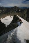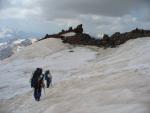 | 7 День (10.08) | 7.1 7.2 | М/н - пер. Голубева (3700) Пер. Голубева - а/л Уллу-Тау | 4ч 10 мин 6ч 40 мин | 3.6 км 3100-3709 H 609 12 км 3709-2390 H -1310 | Солнечно | По морене выходим на левый борт ледника. Сначала движемся по снежнику. Перед выходом на ледник связываемся (есть полости во льду под снежником, неприятно "ухающие"). По открытому, местами закрытому, леднику подходим под перевал. По снежно-осыпному взлету выходим на перевал (крутизна 20-30 градусов). Спуск с перевала по ледовому склону (35-40 градусов). Вешаем 100м перил. Бергшрунд под перевальным взлетом засыпан снегом. За бергшрундом движемся по правом борту ледника. Спуск с ледника на морену под озером. Далее по тропе в а/л Уллу-Тау | |