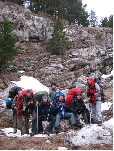 Почти сразу встречается небольшой скальный каскадик, который легко обходится. Минут через 50 движения - следующий мини-каскад (3м), который уже нельзя обойти (вернее, может и можно, но достаточно далеко). Спускаемся дюльфером. Дальше пытаемся двигаться по земляным склонам ущелья, по левому борту, но это оказывается затруднительно - мокрая земля скользит, участники то и дело съезжают по склонам, самозадерживаясь всеми конечностями. Вскоре находим почти у русла площадки, частично заваленные крупными деревьями, и становимся на стоянку. Выше, дальше от русла, тоже есть площадки, и даже с видом получше, но подниматься туда уже лень, к тому же там лежит зловещий, свежий скелет оленя. Необходимо отметить, что вода в русле отсутствует, родники нам не известны, есть лишь остатки снега в русле, которые мы и используем для топки воды. Примерно 7,5 ч.х.в. от стоянки.