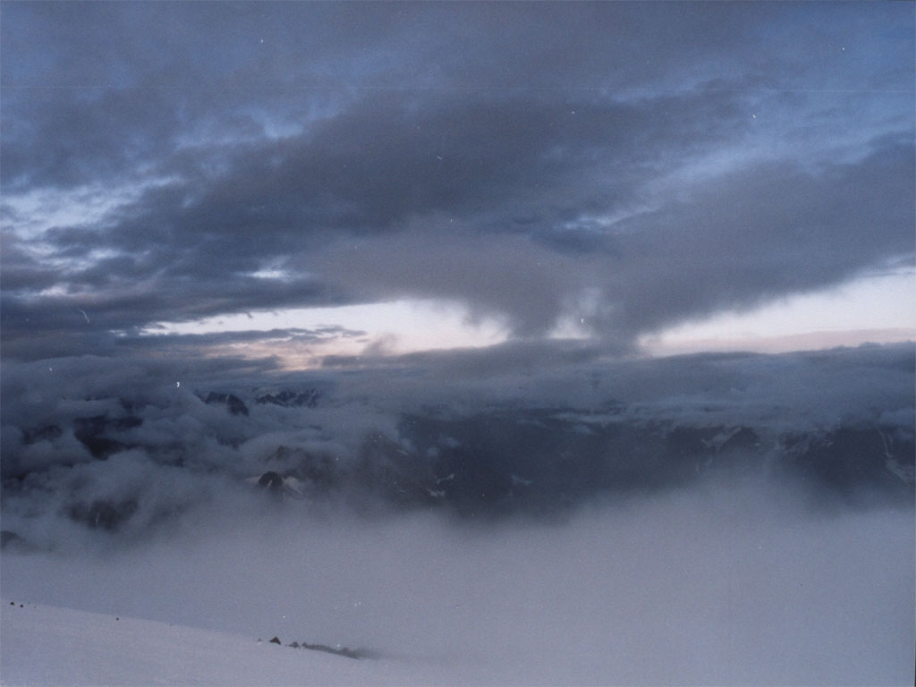Пешком две очереди канатки. Спустилось облако, начался мелкий дождик. Потом он перешел в снег. Настроение ухудшилось. Тучи спустились еще ниже и дождь прекратился. Потом, нафотографировавщись, спустился и я. И снова оказался в облаке. Батл с командой укатил в Терскол, а я остался в гордом одиночестве. Ночью приходили местные малолетки в поисках Оли с голубыми глазами (это под дождем в 23 вечера!), в общем было весело и стремно. (Накануне ночью обобрали поляков - по классике жанра, в масках и с ножами. ) Утром подъем 2 очереди канатки, разговор по душам с мздоимцем Виссарионом, подъем до "бочек" и до "приюта 11". Ночевать на приюте я не захотел - там сплошной туалет! Поднялся еще на 200 м. Начал идти мокрый снег и ветер, который валил с ног. Вобщем упал я на ночевку ок. 4400м.