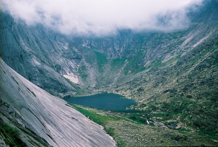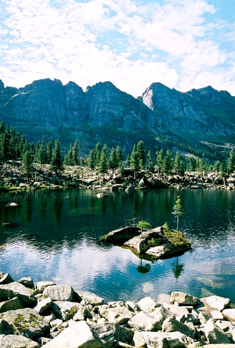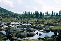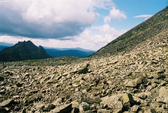 | Большинство стойких ассоциаций было развенчано отнюдь несуровой действительностью: - Комары. Они были, но только внизу, на подходах, т. е в общей сложности дня 3-4 из 23-х. И это были просто чудо, а не комары! Да, они были довольно злые, но зато имели одну замечательную особенность - спать они ложились сразу же после захода солнца, в отличие от нас. Провинция, однако. - Холод. В конце июля в Саянах стояла настоящая летняя жара, хотя короткие грозы проносились почти каждый день. Вода в озерах на высоте полутора километров была совсем теплой, гораздо теплее, чем за месяц до этого в Черном море на ЮБК. Вот уж не думала, что придется с удовольствием и подолгу купаться в горных озерах Сибири. Пусть даже и южной. И даже пришедший на смену этой жаре затяжной дождик, который то лил, то просто накрапывал непрерывно в течении двух дней, тоже был теплый. В мини-радиалки от оз. Светлого, где мы пережидали эту нефотогеничную погоду, я ходила в дождь босиком по роскошным мягким мхам - и было тепло. Если совсем честно, то холодно, конечно, тоже бывало. Жара сменилась вначале просто дождем, затем ливнем, а затем мокрым снегом и даже снежной пургой, которая застала нас прямо на очередном перевале. Но тучи пронеслись, и после двух снежных дней снова вернулось яркое солнышко. Снег быстро превращался в капли, которые искрились и переливались в лучах. - Сырость. Пожалуй, этот тезис себя оправдал. Россыпи озер во всех возможных долинах, долинках и просто впадинах; реки, ручейки, водопады, снежники - всего этого было в изобилии. И постоянное чавканье под ногами - это тоже нормально для тамошних горных хребтов. Да, недаром мудрые аборигенные туристы признают только один вид походной обуви - резиновые сапоги! И резво бегают в них по курумникам. Надо сказать что подножный ландшафт там преимущественно из этих двух компонентов и состоит - вначале идешь и чавкаешь, затем лезешь по куруму, затем снова чавкаешь. Бывает 2 в 1 - курумник в болотце. - Медведи. Ну, медведи, положим, сами людей боятся. И правильно делают - нет опаснее животного, чем человек. В общем, нам "посчастливилось" видеть только продукт жизнедеятельности хозяина тайги. Калибр серьезный, но мы мужественно не испугались! А вот всяческой мелкой живности, и совсем не пугливой, а очень даже любопытной, здесь изобилие: рыжеватые пищухи, полосатые бурундуки и просто банальнейшие, наглые мыши. Мыши, например, вполне комфортно обосновываются на ночь в рюкзаках, подолгу в них шуршат, а затем как-то с недоумением глядят на светящий на них фонарик: "Ну чего тебе? Я тут ужинать собираюсь. ". Так что берегите съестные припасы! |