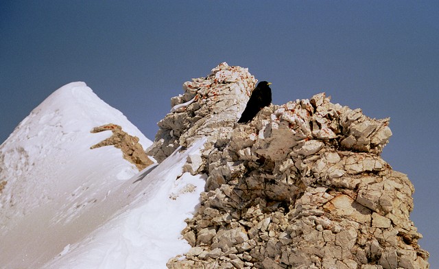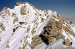 Местами - только траверс по снегу сбоку гребня, а на ледоруб снега не будет совсем - под руками сыпуха. Северо-западные склоны становятся все круче и круче, и сотней метров ниже все обрывается километровой стеной в Австрию.