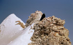 Дотягиваюсь клювом ледоруба до дырки, подтягиваюсь сам, вщелкиваю оттяжку. Решаю траверсировать налево и вверх 3-4м по полке шириной сантиметров 15. В конце ее еще один надежный железный штырь. Руками взяться не за что, хотя скалы совсем не гладкие: вынимаю куски породы один за другим. Нависания нет, но идти надо боком, и 15кг рюкзак сильно тянет назад. Кое-как вылезаю наверх. В 3-х метрах впереди сидит очередная ворона. Принимаю Диму с верхней страховкой. "Как ты тут смог пролезть?"