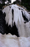 Предлагаю дюльфернуть с моста метров 20 и пройти по низу, осмотреть чудо природы. "Ага, сразу по пояс в ледяную воду. Давай на обратном пути, все равно нам будет все пофиг", - резонно заметил Дима и пошел дальше. С трудом поспеваю за ним. Вокруг на скалах - замерзшие водопады и водопадики,внизу - узкая щель каньона, вся в ледовых наростах.