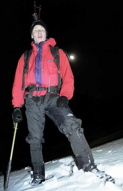 Иногда по ним легче идти - снег немного утрамбован. Дима отстает. Становится видно основание хребта и огни внизу прямо под светом на гребне. Ура! Это наша хата. Ну, мы и блуканули. Туда ведь еще идти и идти. Доходим до какого-то крутяка, его надо обходить, обходим. Глубоко внизу на снегу видны следы - похоже на дорогу. Дорога упирается в какие-то строения; судя по всему, это нижняя станция лыжного подъемника. Как туда попасть? Проще всего в лоб - сначала быстро спуститься, а потом сдохнуть на подъеме по сугробам. Нет, лучше продолжать агонию - траверсировать не теряя высоты. На деле получилось нечто среднее, и в 3 часа ночи первый выхожу к домикам. Дима пока далеко, но даже в неярком свете луны видно, что его уже ничем не остановишь.