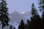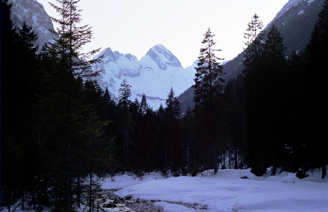 Если бы не цепочка одиноких следов, мы бы заблудились опять: лес негустой и снега уже сантиметров 20-30. Переходим по мостику на правый берег. Там, где над лесом нависает впечатляющая скальная башня, отходит тропа на Оберрейнталь - наиболее подходящее место для серьезных скальных восхождений в районе Гармиша.
