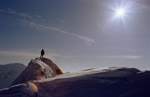 Слева п/х - карнизы. Справа в 10м ниже остается небольшой кирпичный сарайчик (закрыт). Около него на гребень выходит "летний"клеттерштайг и сразу же пропадает в снегу. В 50-ти метрах внизу слева - заброшенная станция канатки в Австрию. Перед выходом к антеннам ретранслятора узкое место - высокий снежный карниз переходит с одной стороны гребня на другую. Дима аккуратно проходит по верху. Заметно как его шатает от усталости. От антенн к строениям на вершине тянется куча проводов, кабель и старый знакомый - трос клеттерштайга. Под ногами сильно обледенелый снег.