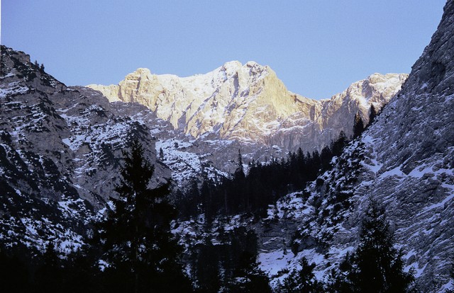 Побробнее маршрут выглядел так [от Гармиш-Пантенкирхена (707м) двигаемся вдоль реки Партнах до ее истоков, проходя через каньон Партнахкламм и по зажатому с двух сторон скальными хребтами ущелью Рейнталь. Оттуда поднимаемся в ледниковый цирк - на плато Цугшпитцплатт, а там остается последний рывок по скалам до вершины Цугшпитце, 2962м. Чем дальше, тем сложнее (интереснее). Летом - это набитая тропа, на которой стоят рефуджии (huette), где можно переночевать и купить поесть, а путь по скалам - клеттерштайг: закрепленный стальной трос и скобы для страховки. Летом можно обернуться за сутки, но не за день. Что нам предстоит сейчас, мы можем только прогнозировать, а это - дело неблагодарное.