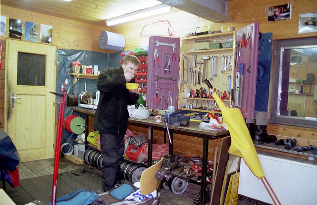 К 8-ми видим в окно, как сверху уже съезжают на лыжах. Заходит здоровый мужик. Сильно удивляется. "Вы что - из Австрии пришли? Вчера после обеда?" - "Нет, сегодня в 3 ночи". Видно, что он нам не верит, но не подает вида. Гораздо проше считать, что мы пришли вчера после его смены и не морочить себе голову. "А вы откуда?" "Я из Мюнхена, он из Киля. А вообще, мы русские", - шутит Дима. "А, понятно", - улыбается мужик.
