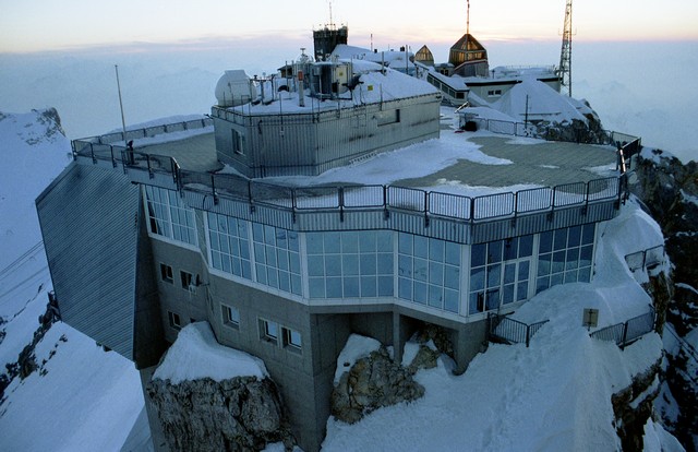 Австрийская часть закрыта напрочь. Но там из трубы поднимается подозрительный дымок. Наверху башни с кучей антенн светятся 2 маленьких окошка. Подлезаю к ним по пожарным лестницам. Первое: пустая комната с кроватью. Второе: сидит мужик и говорит по телефону. Стучу. Мужик отмахивается, даже не повернувшись. Видимо ночные клаймеры его уже достали. Жду немного, стучу опять, настойчивее. Знаками показываю: как закончит говорить, пусть спускается вниз. Через 10 минут открывает дверь. Просим пустить переночевать где-нибудь: на полу ли, на лавках, но внутри. "Ok, go with me". Рассказывает, что он работник метеостанции, что он очень занят, ich muess arbeiten, что ему нельзя отлучаться с рабочего места и т. д. Хотите с ним пообщаться - звоните по круглосуточному справочному телефону "прогноз погоды в районе Цугшпитце". Ведет куда-то вниз, потом еще этажом ниже, далее по длинному туннелю в скале. Повороты, двери, разветвления. Wolfenstein 3D. Назад сами уже не выберемся. Приводит в концеренц-зал: ряды стульев, плакаты, доходчиво разъясняющие, как круто побывать здесь, на Цугшпитце. Передает нас тетечке в халате и с большой собакой. Она зачем-то просит наши паспорта. Наверное, чтобы не надебоширили, хотя реальную причину мы узнали следующим утром.