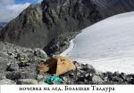 | 11.08 9 день | м.н. - пер. Сибстрин - лед. Б. Талдура | 10:30 - 17:00 | 6,09 | 2600 2900 | пасмурно, дождь с градом | Вверх по мелко- и средне- осыпному склону. Потом передвижение по закрытому леднику, выход на открытый ледник. |
