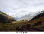 | 22.08 20 день | м.н. - пос. Чибит | 9:00 - 13:20 | 7 | 2100 | переменная облачность | Переходим через р. Чуя по мосту. По дороге спускаемся в пос. Чибит. |