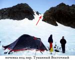 | 17.08 15 день | м.н. - пер. Туманный Восточный | 7:20 - 14:00 | 5 | 2199 2600 | пасмурно, туман, снег | Подход под ледник по крупно-осыпному склону. По закрытому леднику подходим под перевал. |