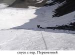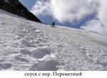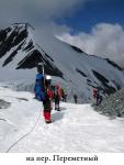 Проходим в связках,подъем представляет собой 70 м снежно-ледового склона, крутизной до 45°. Снег смерзшийся, проходим частично по пробитым вчера предыдущей группой ступеням, частично пробиваем сами. Тур расположен на камнях рядом с границей снега прямо возле памятника погибшим туристам. При спуске с перевала провешиваем 2 веревки перил, крутизна склона до 35°, лед. Далее двигаемся в связках по закрытому леднику Малый Талдуринский, в долину реки Атбаши.