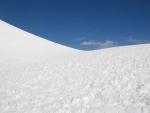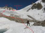 Дальше на юг ведет осыпной и снежный склоны, возможны связки и внимательное прохождение снежных мостов над ручьями в кулуарах морены. Они могут быть хрупкие и содержать пустоты над значительными понижениями морены.