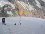 Спускаемся по пути подъема. При прохождении верхнего взлета на спуск наводим 5 веревок перил до выполаживания перед вершинным взлетом (рис.102), второй участок спуска проходим в связках, третий участок спуска проходим в связках, в нижней части спуска при выходе на лед движемся, организовывая ледобурную дорожку.