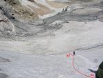Спуск в сторону р.Сурхоб по разорванному снежно-ледовому склону с ледовыми лбами - необходимо наведение перил для избежания падения участников в трещины или срыва на ледовых лбах.