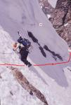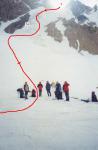 | плато после пер. взлета Селлы | 4350 | -100 | 0,3 | 0,4 | 0:40 | снежно-ледовый склон | бергшрунд (с пробками) | 1 веревка на спуск |