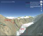 От места ночевки на морене правого притока ледника Шаугадо движемся вверх по леднику.Ледник местами открыт, местами зачехлен покровной мореной. Идем несвязываяcь предпочитая двигаться по моренам. В целом ледник в этойчасти пологий, но имеет много локальных понижений и повышений, напоминающихледовые бархан. Такая форма вероятно вызвана неравномерностью таяния льда. С в.5142 который справа по ходу довольно часто идут камнепады и небольшие лавины.Все они идут по узким вытянутым кулуарам, которых на горе много. Идти у подножья горы не рекомендуется. За чч часа подходим до подъема на верхнюю ступень цирка. Верхний цирк отделен от нижнего крутой ледовой ступенью которая вся изрезана большими разломами. Безопасный проход в ней не просматривается. Самый пологий вариант подъема на верхнюю ступень виден через левый по ходу ранклюфт, но камнеопасный. При нас там прошел не один камнепад.