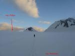В месте, где крутизна гребня достигает 35гр, начинаем вешатьверевки. Склон в верхней части перерезан бергшрундом. До выхода к бергшрундунавешиваем 4 веревки дюльфера. Все они со станциями на снегу. Сдергиваемледорубными крестами. Бергшрунд большой, засыпанный снегом. Его верхняя стенказначительно возвышается над нижней. Пологий проход есть в правой по ходу частибергшрунда. При подъеме на перевал со стороны лед. Абдукогор это местоиспользуют для ночевок. И это фактически единственное пологое место на всем перевальномвзлете.