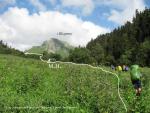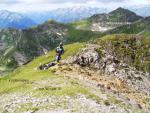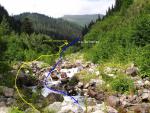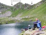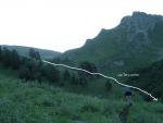 Подход к перевалу Загедан 1Б, начинается от места слияния реки Загеданка, с рекой Б.Лаба, в районе размещения погранзаставы (фото 1, 1.1, 2). С дороги, необходимо двигаться по дороге, вдоль по руслу реки Загеданка. Примерно через 30 минут движения (угол склона до 30 градусов), дорога пересекает реку Загеданка, где реку приходится пере йти вброд по одному - уровень воды 30-50см (фото 3). Сразу после брода есть удобное место для стоянки - ровные площадки под 4-5 палаток, вода из реки. Отсюда начинается крутой (до 40 градусов) продолжительный подьем к верхним лесоразработкам. Время движения от брода до площадки лесозаготовки 70 минут ч.х.в, всюду грунтовая дорога. Отсюда необходимо двигаться далее вверх вдоль русла реки, по тропе, и через 10 минут выйти к руслу реки Загеданка (фото 4). В этом месте необходимо пересечь реку в направлении правого берега, так как тропа дальнейшего подъема находится там (фото 5, 5.1). Для пересечения реки мы нашли импровизированный мостик (сбитая из жердей и досок платформа, полностью покрывающая ширину русла реки), по которому без затруднений преодолели препятствие. Даже в отсутствие мостиков, пересечь реку не замочив ноги, не составляет труда: во многих местах реку можно перескочить по камням, сняв, для уверенности, рюкзаки. Тропа в направлении перевала, в этом месте проходит между зоной леса (местами заходя в него) и каменистым берегом реки. Тропа грунтовая. В районе верхнего разветвления рукавов реки, тропа берет в сторону правого притока, уводя нас за холм и создавая впечатление движения по ложному пути, но потом, после перехода притоки, поворачивает круто вправо, выводит на пригорок (10 м с углом около 60 градусов). Всюду очень высокая трава, которая затрудняет как видимость так и передвижение группы. Остановится на бивуак нет где. После этого движения вдоль зоны леса практически не будет. Тропа убегает между высоким разнотравьем (фото 6, 6.1, 7), в направлении последней посадки деревьев - так называемым здесь ?берёзкам? - отличительно большой посадке берёз, вперемешку с дубом. Тут есть несколько мет для стоянок. Вода из реки Загеданка, к которой необходимо сбрасывать примерно 45м высоты. От места последнего брода до ?берёзок? примерно 2,5 часа ч.х.в. Подьем трудоемок: продолжительный крутой набор высоты, практически полностью в травянистых зарослях, где встречаются колючие растения и цветы. От ?берёзок? необходимо двигаться далее по тропе, которая, еще 15 минут будет проходить по долине, а после, начинает серпантин вверх к верхней долине реки Загеданка (фото 7). Продолжительность этого подьема примерно 50 минут. В верхней точке подьема, месте перехода в верхнюю долину реки Загеданка, открывается вид на перевал и долину (фото 8). Далее двигаемся вдоль долины в направлении перевального взлета. Всю долину пересекаем за 40 минут (периодически двигаемся то по осыпи, то по траве) (фото 9, 10). В последнем цирке, в 10 минутах от начала перевального взлета (фото 18), удобно поставить лагерь - много ровных площадок, несколько ручьев с водой, красивый вид вечером (фото 17), есть возможность сходить на Загеданские озера, расположенные на другом берегу ручья, выше места расположения лагеря (путь подьема на фото 12, 12.1), дров нету (фото 11, 12, 13). Фото с озер 14, 15, 16, время подьема к озерам 50 минут, спуска 25. Перевальный взлет перевала Загедан - протяженный, скально-осыпной 