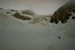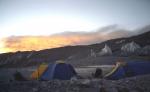 Долина реки Чимген поражает своими размерами. В ее верховьях лежит один из крупнейших ледников района, начинающийся под южными стенами Конгура. | Выход на плечо Конгура (5511) преследовал две цели: акклиматизироваться для предстоящего траверса Кызылселя и разведать подступы к южной стене Конгура для будущих экспедиций. Мощный снегопад заставил нас быстро ретироваться с высоты 5265м. |