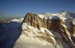 Пик Коксель на рассвете. | С плеча Конгура хорошо виден левый борт ущелья Чимген с прячущимся в облаке пиком Николаева, пройденным командой Лебедева в 2003 г. |