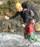 За відсутності прийнятного місця ночівлі, вирішуємо продовжувати рух за маршрутом. Через високу засніженість схилів, стежка що звертає в напрямку Білої Тиси не проглядається. До очікуваної стежки спускаємося з хребту по схилу 20-30 в пн.-сх. напрямку. Під час спуску приймаємо рішення дістати льодоруби (фото 16). Спустившись до річки, через неповний перехід по правому берегу, виходимо на галявину (47.966995 24.549133). О 20:50 влаштовуємо бівуак.