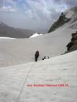 Ещё вчера нам удалось разглядеть и определиться с путём подъёма на ледник, стекающий с перевала Бокбаш Лож. Язык ледника и его нижняя часть смотрелась устрашающе и представляла из себя ледник, круто стекающий в долину полностью зачехлённый камнями, которые падали вниз при вытаивании на солнце. Естественно по такому леднику подниматься неудобно да и после наблюдения многочисленных камнепадов, которые происходили по всей ширине ледника речь об этом даже не шла. То есть ледник необходимо было обходить. По правому борту ледника никакой перспективы не просматривалось, зато левый борт внушал надежду. Выходим в 6-40 и начинаем движение по намеченному пути, ориентируясь на снежник, за которым было явное выполаживание ледника. Подойдя поближе к правому борту заметили ярко выраженный гребень, по которому и начали подниматься. Характер склона постоянно менялся: сначала это был достаточно крутой травянистый склон, затем осыпной, иногда приходилось применять технику лазанья для подъёма на отдельные выходы скал высотой до 2 метров, затем склон выполаживался и снова набирал крутизну, постоянно меняя свой характер. Слева по ходу от нас мы наблюдали ледник, точнее это было некое месиво камней. Продвигаясь по гребню вверх мы увидели ручей, стекающий примерно с того места, где находился намеченный нами снежник. Мы оказались на левом его берегу. Через некоторое время стало понятно, что этот ручей нужно будет перепрыгнуть и продолжить движение по правому его берегу. Для этого мы поднялись к скалам левого борта по крутому склону, который представлял из себя слежавшуюся глину с выходами травы и местами лежащей на ней мелкой осыпи. Вообщем рельеф не из приятных. Если бы была возможность закрепить где-нибудь верёвку, мы бы это сделали, однако это было невозможно. Некоторые участники чувствовали себя не уверенно на таком рельефе. Мы их поставили в середину группы между более уверенными участниками для возможности придержать, если вдруг кто сорвётся и двигались плотной группой. Подойдя к скалам начали траверсировать склон к ручью. Траверс был примерно такого же характера, как и подъём к скалам без какой-либо возможности застраховаться. Перепрыгнув ручей, в 9-35 мы вышли на травянистый склон, где около часа отдыхали от напряжённого участка подъёма и руководитель успокаивал некоторых участников, которые очень перенервничали в процессе подъёма по нему. Когда все успокоились и уже начали шутить по поводу пройденного участка мы продолжили подъём в направлении снежника и под самым верхом свернули немного левее по ходу, не выходя на сам снежник. За 30 минут от длительного привала мы вышли за перегиб и наконец-то увидели верховья ледника. В 11-30 стали на обед среди крупных камней на леднике. Обедали долго, никуда не спеша, так как в это время очень жарило солнце. После обеда мы продолжили движение по камням, которые чередовались со снегом, забирая влево по ходу, на основное тело ледника и за 2 перехода по 35 минут мы на него вышли. Здесь ледник без трещин, в основном открытый. Мы же, чтоб не спать на льду, решили поставить лагерь возле самой осыпи, где было много снега. Воду брали из замерзшего озера, находящегося в 50м от лагеря, выдолбав в нём лунку.