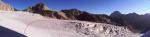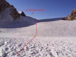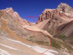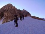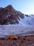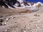 Выходим в 8-10 и начинаем резко подниматься вверх на правый борт ручья, стекающего с ледника перевала Музыкантов. В среднем и нижнем своём течении ручей течёт в каньоне, возможность движение по которому вверх неизвестна . Из отчётов мы знаем, что каньон обходится по правому борту, поэтому ещё вчера произвели разведку этого варианта, которая это подтвердила. Довольно быстро набираем 300 метров по высоте и начинаем траверсировать правый борт по осыпи. При траверсе встречаются участки скал, которые особых трудностей не доставляют. В 10-15 выходим на очередные скалы правого борта, с которых следует спуск практически к реке, которая здесь уже течет не в каньоне. С этого места отлично виден дальнейший путь к перевалу. На участке спуска в 11-15 подходим к ручью, который стекает с западной части цирка и становимся здесь на обед. После обеда спускаемся к траве и продолжаем движение по травянистому склону, затем переходим на осыпь, перепрыгиваем грязный ручей, стекающий из-под ледника, и выходим на левобережную морену. По ней и движемся, не выходя на ледник. С морены открывается вид на красивейший ледопад, при обходе которого мы выходим на снег. На всякий случай связываемся, и по снегу, чередующемуся с осыпью, выходим выше ледопада. В 17-00 становимся на ночь на левобережной морене.
