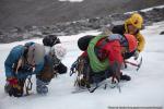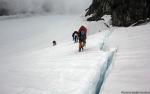 После перевала спускаемся по леднику, где тоже обнаруживаем великолепную картину: -огромный разлом льда, куда мы не преминули залезть на небольшую экскурсию.