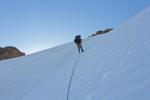Встали рано, вышли в 04:40. Двигаемся по осыпи, обходя снежники справа по ходу. Вскоре подошли к небольшому кулуару, который выводит на перевал. В кулуаре остался нерастаявший снежник, решаем обойти его слева свободным лазанием по несложным, но разрушенным скалам. В 06:50 вся группа была на перевале. Нашли два тура с записками, написали свою. Сфотографировавшись, начали готовится к спуску. К этому моменту нас догнала группа наших друзей из Киева, спускались с перевала почти параллельно. По описаниям, есть возможность упростить спуск, если после первой веревки выйти на скалы слева и оттуда провесить одну веревку до ледника. Но, спустившись к скальным выходам и просмотрев путь спуска, мы категорично от него отказались. На леднике виднелись следы свежих каменных обвалов с разрушенных скал. Было решено спускаться по безопасному ледовому ?парусу? Бригантины. В результате провесили 5 веревок по 40-50° склону по левой ор. части ?паруса?, к засыпанному снегом бергшрунду. Спустившись, разбились на связки и пошли по направлению к ледопаду, который виднелся слева. Спуск по веревкам занял у нас 2 часа 30 минут ЧХВ. Ледопад оказался несложным, но довольно крутым. Некоторые организовали себе страховку через спусковое устройство. В 11:30 все собрались на пологой открытой части л. Кельтор В. и пошли вниз, постепенно приближаясь к правой стороне. Недалеко от окончания ледника вышли на морену, развязались, сняли системы и по мелкой осыпи спустились к первому правому притоку р. Кельдике. Перейдя его по камням, вышли на неявную тропу, обозначенную маленькими туриками. Сначала тропа идет возле самой речки, потом начинает подниматься на травянистый склон. Вскоре спускаемся опять к воде, и преодолев два больших каменных завала, выходим к широкому разливу р. Кельдике. Мы планировали, где то здесь и заночевать, но удобных площадок не было. Берега заболоченные, неровные, много коровьих лепешек, соответственно вонь. В поисках места для ночлега продолжаем спускаться вниз. За разливом тропа идет по каменным россыпям и через кустарники, двигаемся медленно. Появляются деревья, в основном тянь-шаньские ели. Через некоторое время, пройдя через небольшой лес, подходим к еще одному правому притоку, за которым находится большая поляна. Перешли приток по камням и решили, что заночуем здесь. Место действительно оказалось очень живописным. Поставили лагерь, поужинали, и провели остаток вечера в беседах возле костра. Все сложное уже осталось позади.