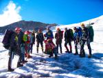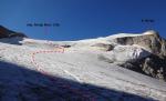 От поляны, уже одетые в системы, поднимаемся по травяному склону (20-25 оС) на моренные валы правого борта долины. По боковой морене доходим до ледника, где надеваем кошки и берем в руки ледорубы (фото 70). Выходим на ледник, поднимаемся слева направо, по наиболее пологому участку (фото 71). Крутизна ледника увеличивается постепенно от 20о, в верхней части крутизна склона достигает 35о(10 метров). Данный участок (у вытаивающих скал) преодолеваем на три такта (на клювике) (фото 72). На всем участке перевального взлета двигаемся зигзагом. Общий путь показан на фото 74.