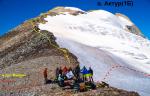Восхождение проходит по гребню (фото 73), по сыпухе и снегу. В сторону ГКХ подъем характеризуется крутыми скальными обрывами, в сторону д. р. Джалпакол есть небольшая, довольно пологая полоска, до 10 м ледника, покрытого снегом. Стараемся идти по камням на крутых участках и по снегу на пологих (фото 75). Между перевалом и вершиной по гребню располагается промежуточная вершина (фото 76). Между ней и вершиной есть небольшое живописное озеро в мульде, которое обходится по снегу с правой стороны (по ходу движения) (фото 77). За которым следует наиболее сложный участок подъема на вершину - это осыпь на скалах 1 к. с, которая начинается немного выше озера. На всех осыпных участках восхождения просматривается тропа.