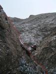 Через 40мин. подъема по травянистому гребню подходим под скальный гребешок. Скалы не сложные, но частично покрыты снегом и натечным льдом – вешаем еще одну перильную веревку. Веревка закрепляется на петлях, накинутых на скальные выступы.