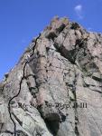 От пер. Сквозной траверсируем подножье г. Сулахат до входа в наклонный кулуар со снежником. Это наш путь подъема на гребень (фото 14). В кулуаре довольно много снега. Нижняя его часть, которую по описаниям ходят по осыпи также завалена снегом (смерзшимся так как это утро). Поэтому провешиваем здесь веревку (участок R1)(фото 1). Дальше можно идти либо по снегу, либо по осыпному кулуару левее нашего. Но левее явно камнеопасно, поэтому идем в кошках по снегу. Из кулуара по полке выходим на гребень. От места выхода гребень уходит круто вверх на Юж вершину (фото 2). Но мы по нему не идем, а проходим по широкой до 1 м полке (полка и дет со стороны дол Джаловчат) на перемычку пер. Юж. Сулахат. На перевале небольшой тур (фото 3). С перевала подымаемся 25 м по несложным скалам не вершину Юж. Сулаха (участок R2) (фото 4). С вершины уходим по наклонным плитам на перемычку между юж. и Ц. Сулахат. С перемычки по широкой (до 1 м) наклонной полке подходим к входу в кулуар (полка со стороны дол. Алибек). (фото 5) Начинаем движение по правому по ходу борту кулуара. Провешиваем 4 веревки до выхода на гребень. Первые три по несложным скалам (участки R3- R5). Последняя перед выходом на гребень - несколько сложнее (участок R6) (фото 6-8). На участке встречаются новые крюки со спусковыми петлями. Далее идем еще 100 м по простому гребню (фото 9) до стенки 50 м около 70? (участок R7). Провешиваем еще одну веревку (фото 10). Следующий жандарм. обходим слева по ходу по широкой наклонной полке (фото 11) и выходим на вершину Ц Сулахат (фото 12). С вершины идем по полкам сначала справа походу до перемычки, а потом обходим жандарм так же по полкам с левой стороны (по ходу). Таким образом, оказываемся на перемычке между Ц. и С. Сулахат. На в. С. Сулахат решили не идти, т.к. весь это путь занял у нас много времени, а световой день все таки ограничен и нам надо еще дойти до лагеря. Поэтому по полке опять же слева по ходу обходим вершину С. Сулахат и выходим к снежному гребню ведущему на перевал Волосы Сулахат. Траверсируем склон в связках до выхода на перевал (фото 13).