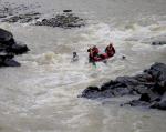 10:00. Пакуемся, привязываемся. Переправляемся на правый берег. Устанавливаем людей для фото-видео съемки. Порог: река разбивается островом и небольшой отмелью на 3 основных протоки. Слева широкое мелкое забитое камнями русло, сюда же впадает водопадным сливом небольшой левый приток. Проход возможен по центру между островом и отмелью или из под самого правого берега. Заход по центру по мощному входному сливу, после 2х больших косых валов, несет на каменную гряду слева, перед ней улово. Страться держаться ближе в центр, тогда не смоет в улово и отобьет от гряды. Дальше струя уходит прямым курсом в правый берег. При проходе из под правого берега, пробивая центральный слив с косыми валами, цепляться вправо - дальше действовать как при прохождении по центру. Одна четверка на выходе из порога, угребаясь от прижима слева, слишком сильно перегребла и не успела выставить нос по струе, от чего несильно ударившись о правый берег реки, сделав бабочку закончили прохождение порога кормой.