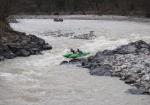 13:00. Наконец-то мы у ?1-го каменомостского?. Здесь сужение русла, белая, кипящая вода, ярковыраженные будто мощенные булыжником скальные выходы по обоим берегам Кубани. На входе по среди реки булыжник, делящий струю на попалам. Левая непроход из-за малой воды. Просмотр и страховка с правого берега. Порог мощный (!), но технически несложный, прямой, лавировок, уходов, прижимов, пульсирующих валов нет, все бочки проносные. Главное удержать кат по струет и не подставлять валам бок. Девчонки на ?зеленке? так старались, что сразу за камнем на входе незапланировано встали в улово, постояли, отгреблись и ?бабочкой? вышли из порога. В 50-60м за каньоным выходом из порога с правой стороны большое улово с песчаным пляжиком - чалится рекоменду здесь. Порог прошли все, с вещами.