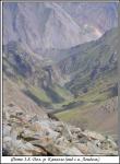 Спуск с перевала идет по мелкоосыпному склону длиной 300-400м. (Video 3) Спуск камнеопасен - идем плотной группой. Спустившись по склону оказываемся в верховьях дол. р. Талды-Кель. Долина, как и спуск, осыпная. С этого места выше по долине хорошо видны осыпные склоны в. Джырты (фото 3.9). Продолжаем спуск по долине. Спуск идет без тропы по средней осыпи. По долине спускаемся до зоны, где появляется трава. Здесь становимся на ночевку. (Video 3) Высота ночевки по GPS - 3850м. В месте ночевки много дикого лука и еще больше сурков :) .