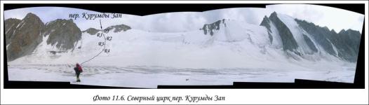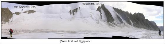 Верховья долины Курумды разделены двумя небольшими отрогами на три цирка. В восточном цирке находится перевал Моррисон (N77) который выводит в дол. р. Сары-Могол, в Центральном цирке находится пер. Зап. Курумды (N73) который выводит в дол. р. Киндык, в западном - непройденный на сегодняшний день пер. N 71 так же выводящий в дол. р. Киндык. Все цирки осыпные. Подъемы на все три перевала со стороны дол. Курумды имеют похожий характер - средне и мелкоосыпной склон протяженностью 200-250м. (Video 11)