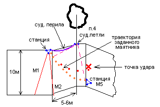 Этап, на котором произошла травма, представлял собой спуск маятником от верхней точки маршрутов М1 и М2 к началу траверса - маршрута М5. Высота М1 и М2 - около 10-ти метров. Точка закрепления маятника находилась в 5-6м от верхней точки М1 и М2, подход осуществлялся по судейским перилам. Точка закрепления расположена выше где-то на 0,5-1м по отношению к точке начала маятника (верхняя точка М1 и М2).