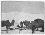 Лошади шли по слѣдамъ верблюдовъ, волоча по снѣгу вьюки и стремена. Молчаливо и тяжело тащился нашъ кара ванъ. Наконецъ, на холмѣ показалась юрта, похожая на черную точку среди этого безграничнаго бѣлаго снѣжнаго океана; рядомъ суетились люди, разбивая другую юрту. Намъ оставалось пройти до нихъ только 120 м., но дорога шла по оврагу со снѣгомъ въ 2?3 метра глубины, и мы бились больше часу, чтобы благополучно провести нашихъ вьючныхъ лошадей.