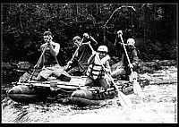 В целом, речка для подобных плавсредств не особо опасна – в низкую воду единственная трудность - постоянное перетаскивание катамаранов «на себе» по причине недостаточного количества под катамараном воды. Был только один пробой у одного из катамаранов – на большом гвозде, торчащем из бревна-топляка. Маршрут содержит около 60 порогов. Из них особого внимания заслуживают 3 порога категорий 3а и 3б. Их проходили на разгруженных катамаранах (см. фото). Кроме этого есть один или два порога 2 категории (один из них опасен наличием разваленного деревянного моста перед ним). Кроме того, есть один несложный порог, зато его длина составляет около километра – весьма выматывает. Особенно если учесть, что после него надо довольно долго идти до ближайшей толковой стоянки.